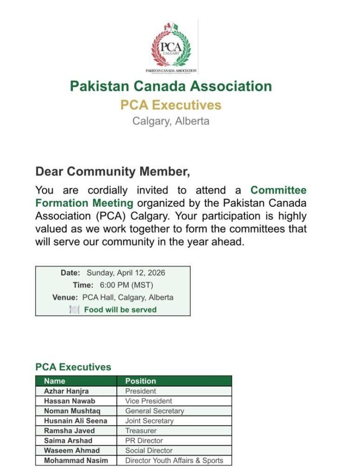 ByBWTimesApril 12, 2026The Pakistan Canada Association Executives are organizing a committee formation meeting and have invited all Pakistani community