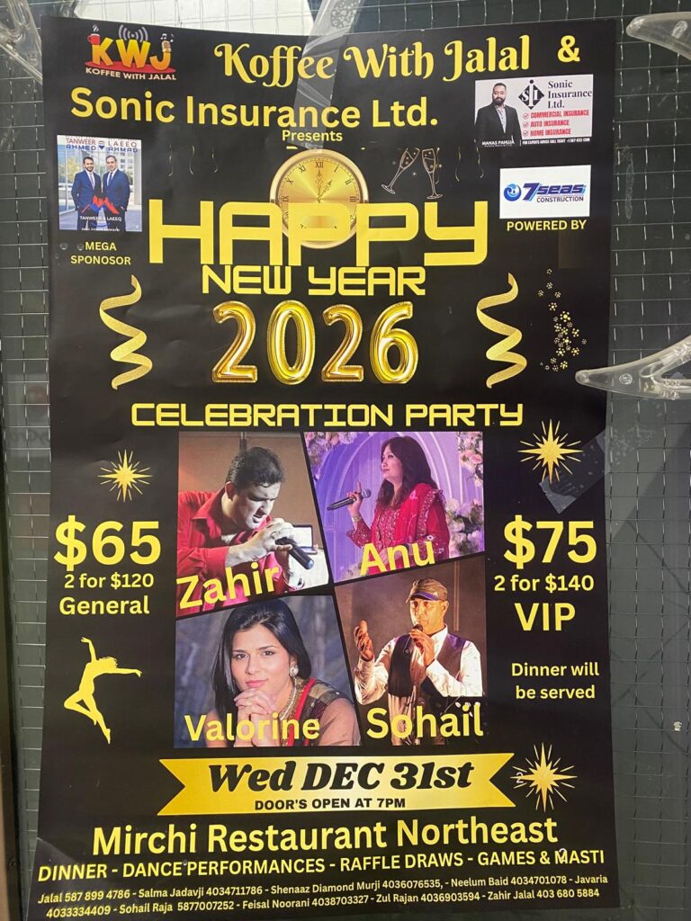 Another event will be held at Mirchi Restaurant, North East Calgary. The host of the celebration is Coffee With Jalal, and the name of the event is “Happy New Year 2026.” The main singers of the night are Sohail Raja, Anu, Zahir, and Valorine.
