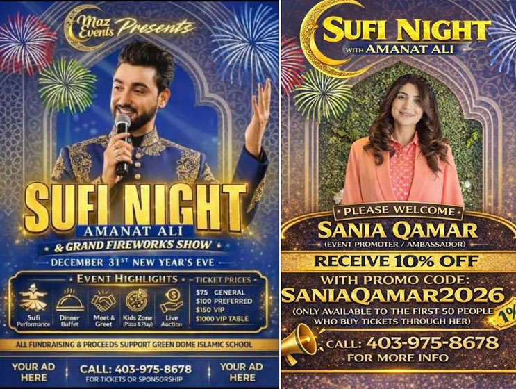 Maz Events presents “Sufi Night” and Coffee With Jalal organizing “Happy New Year 2026.” As around the world, every country is getting ready for New Year celebrations, fireworks will start in the first second of 2026. Somewhere, the New Year will begin with prayers. In Calgary, the Pakistani community’s big event will be celebrated at Green Dome Hall with famous singer Amanat Ali, who rose to international fame after participating in the Indian music reality show “Fame Gurukul.” Event promoter Sania Qammar will be the host of the show. In this Sufi Night event, fireworks and many other attractions will be included.